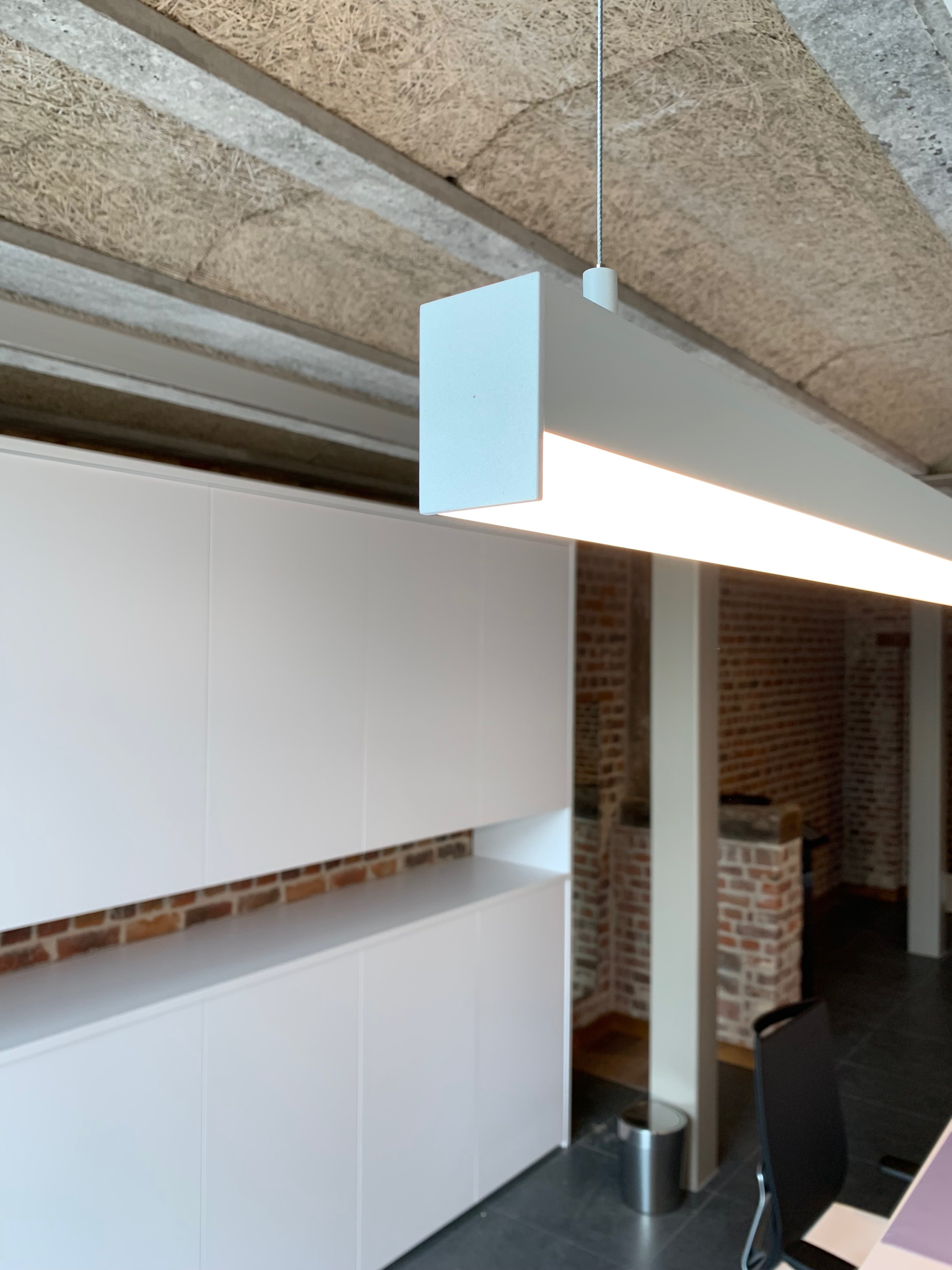 Algemene elektriciteitswerken, plaatsen rails met LED verlichting, aansluiten en bekabelen burelen, inbouwen van BACHMANN in burelen met USB, data, stopcontact aansluitingen en HDMI connectie in de vergaderruimte.